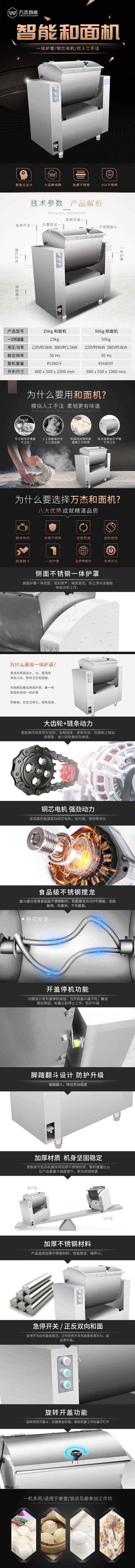 ■ 主要技術參數(shù): 一次和面量:25KG 產(chǎn)品型號:WJ-HMJ50A 一次和面量:50KG 額定電壓:380V 功 率:3.0KW 外形尺寸:980×550×1060MM 機器重量:220KG ■ 性能特點: 1. 采用腳踏翻斗,降低勞動強度 2. 具有掀蓋停機功能,集成線路板起過載、短路、缺相、過壓、欠壓保護作用,穩(wěn)定系數(shù)高 3. 采用銅線電機,配備好的減速機,穩(wěn)定耐用噪音低 4. 面斗部分采用好的不銹鋼制作,和面攪龍為304不銹鋼,堅固耐用,美觀大方 ■ 產(chǎn)品介紹: